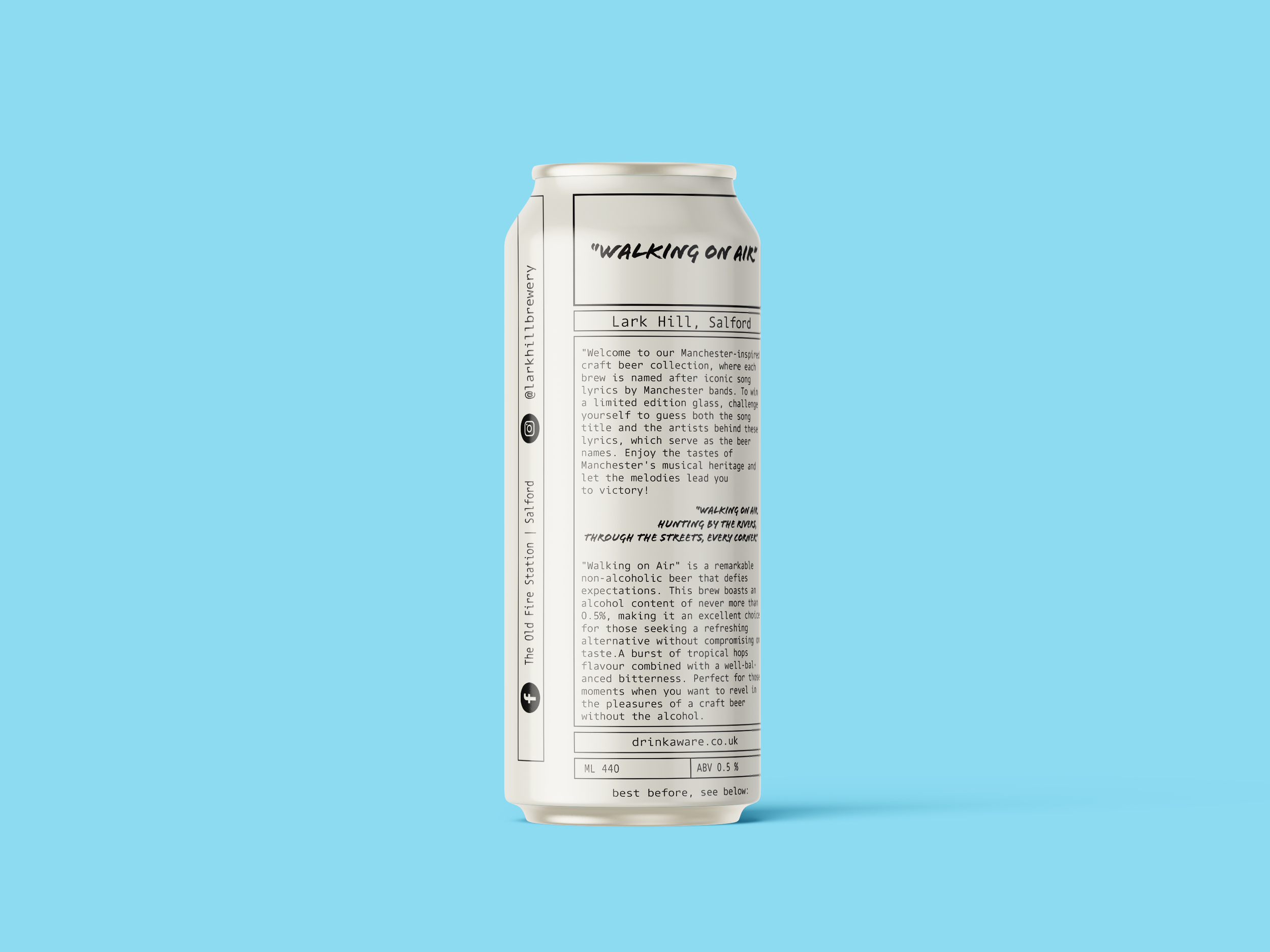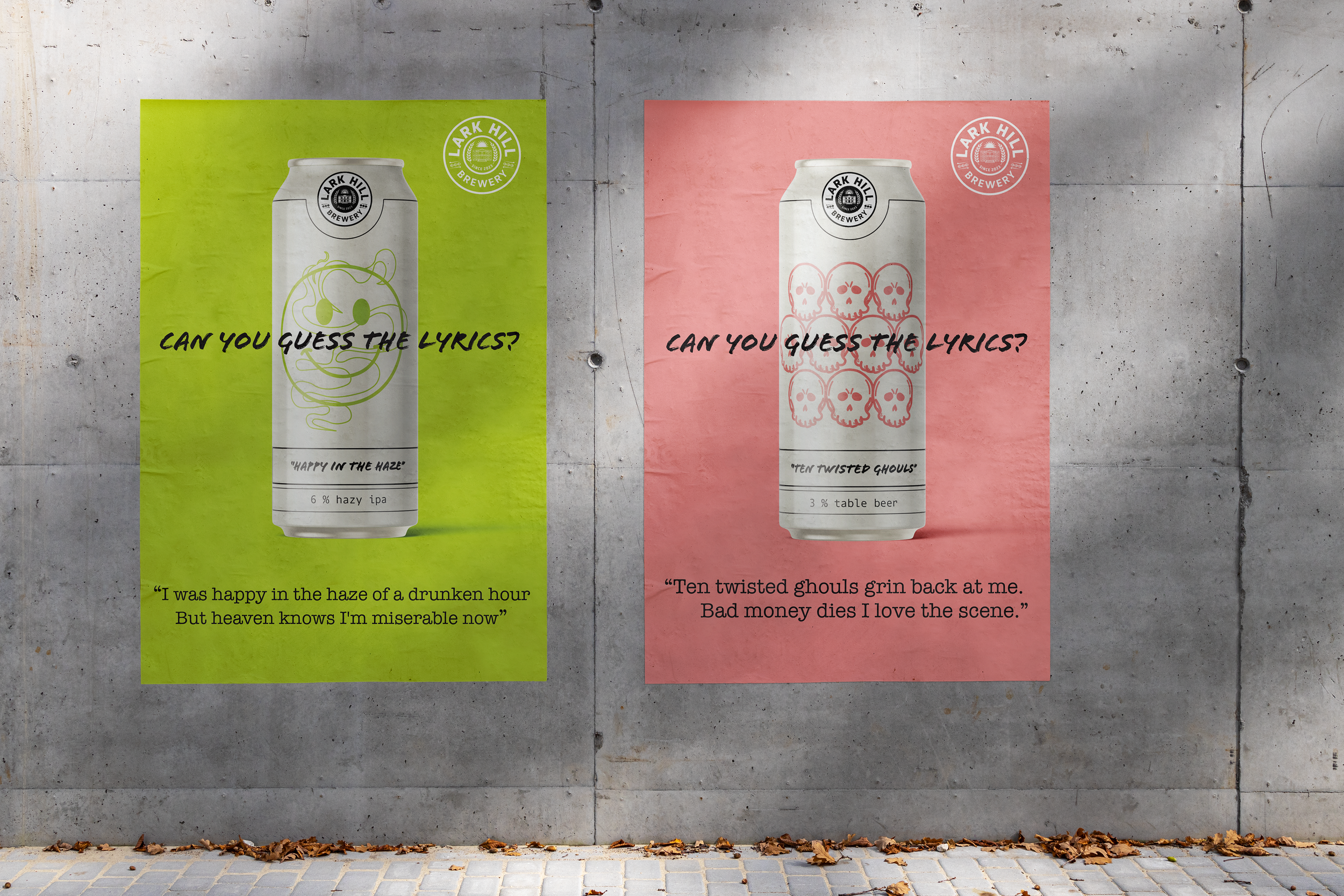 Craft beer can designs created for the launch of 12 new flavours by Larkhill Brewery, Salford. Inspired by the vibrant Manchester music scene, each brew is named after iconic song lyrics by Manchester bands. The entire collection transforms into a delightful pub quiz for enjoyment with family and friends.